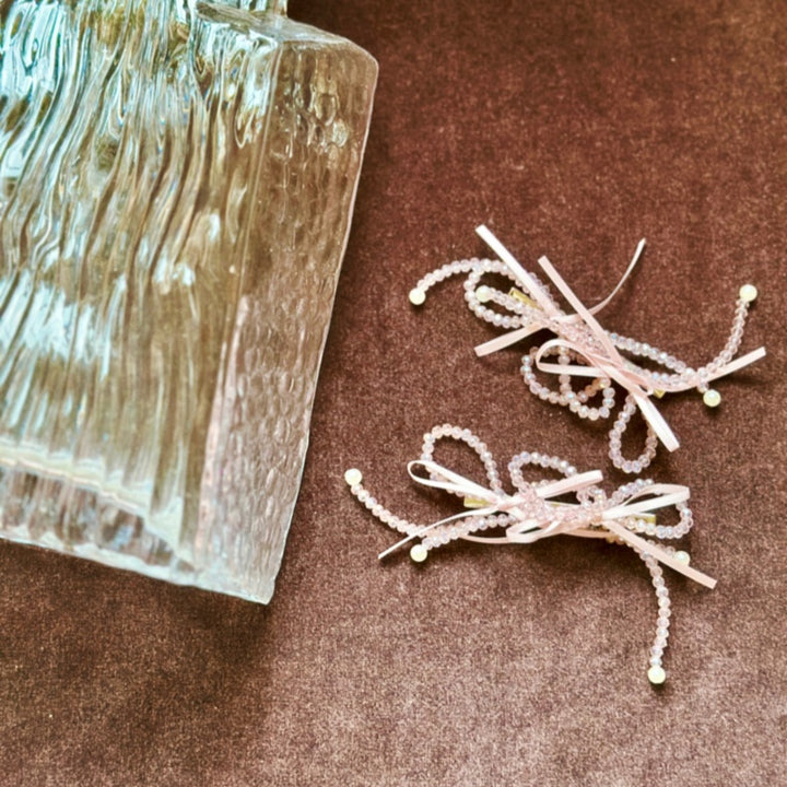 This hair barrette set featuring soft pink ribbons, crystal beads, and pearl accents, shows a dreamy combination of elegance and playfulness. The design captures a romantic, fairy-like aesthetic.